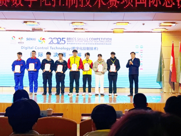 2025年12月13日至16日,2025金砖国家职业技能大赛“数字化控制技术”赛项国际总决赛在济宁职业技术学院圆满举行。大赛汇聚了来自金砖国家及地区的40余支精英队伍同台竞技。南京工业职业技术大学电气工程学院代表队表现出色,凭借扎实的专业技能与稳定的现场发挥,在激烈角逐中脱颖而出,一举斩获国际总决赛一等奖。
