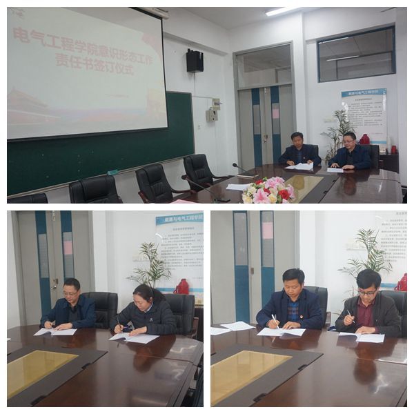 4月3日下午,电气工程学院全体教职工在求真楼304会议室召开了分院大会。会上,电气工程学院院长杨战民传达了近期学校会议相关精神,其中包括诊改、技能大赛、课程建设相关方面的部署。吴国中副院长、朱旭平副院长就分管工作强调了几点注意事项。最后,马多勇书记传达了学校相关会议精神,就党风廉政建设、意识形态工作要求、师风师德要求和课堂质量提升制度化、常态化管理作出了部署。会议以后,电气工程学院举行了意识形态工作责任书签订仪式,马多勇书记分别与所有班子成员、教学部主任代表和党支部书记代表签订了《南工院电气工程学院意识形态工作责任书》;杨战民院长与教学部主任代表也签订了《南工院电气工程学院意识形态工作责任书》;马多勇书记分别与党总支委员、党支部书记代表签订了《南工院电气工程学院2019年落实全面从严治党责任书》。